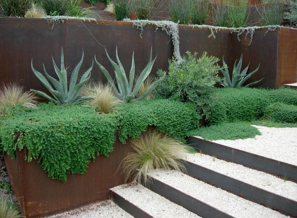 2.Κήπος XERISCAPE σε αναβαθμίδες (μεταλλικές αντιστηρίξεις) με Αγάβες, Σέδο έρπον, διακοσμητικά γρασίδια (Πηγή: houzz, USA)