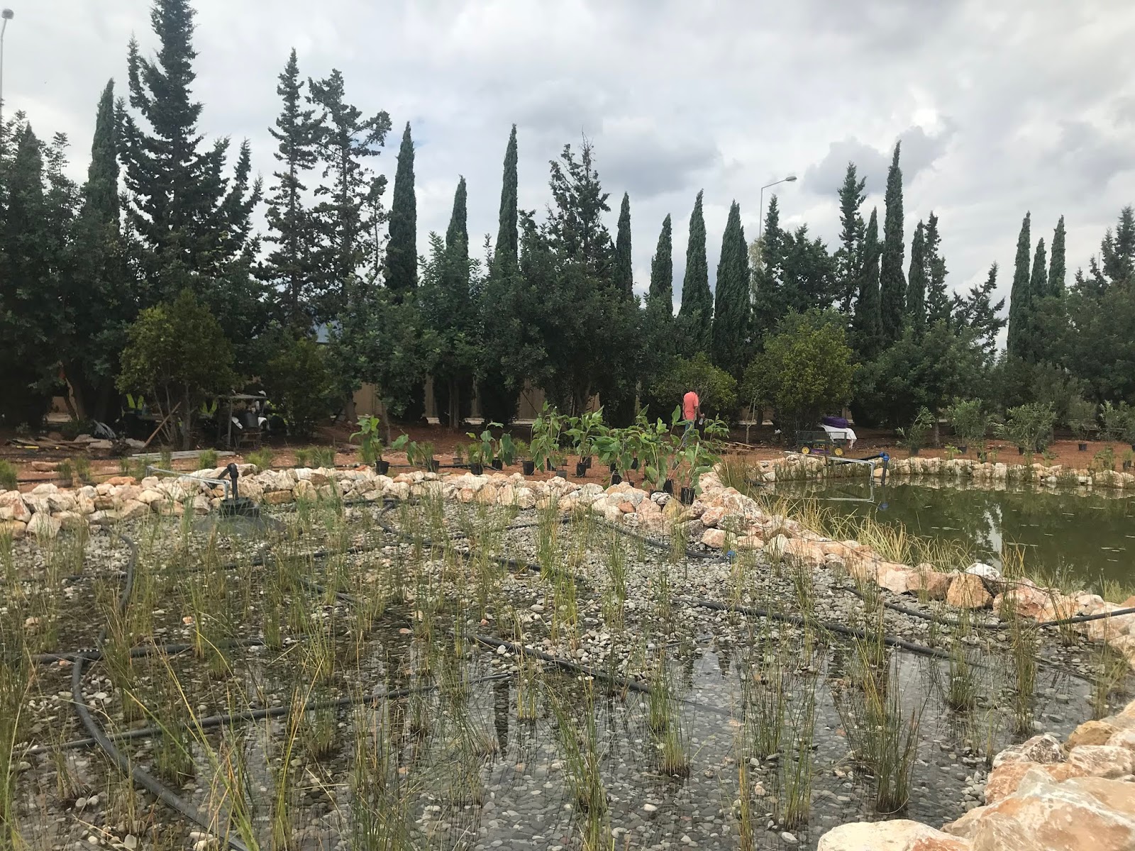 Σε αυτήν την πρώτη δεξαμενή που πληρώθηκε με βότσαλο και φυτεύτηκε δεχόμαστε αρχικά το νερό από τον βιολογικό όπου γίνονται οι βιολογικές επεξεργασίες και από εκεί μεταφέρεται στην δεύτερη Η λίμνες καλύφθηκαν με βράχους εξωτερικά, βότσαλο και άμμο εσωτερικά ενώ τοποθετήσαμε και τα απαραίτητα στεγανωτικά υλικά στον πυθμένα με την αναγκαία διάταξη προστασίας τους και βρίσκονται υπό συνεχή κατάκλυση .