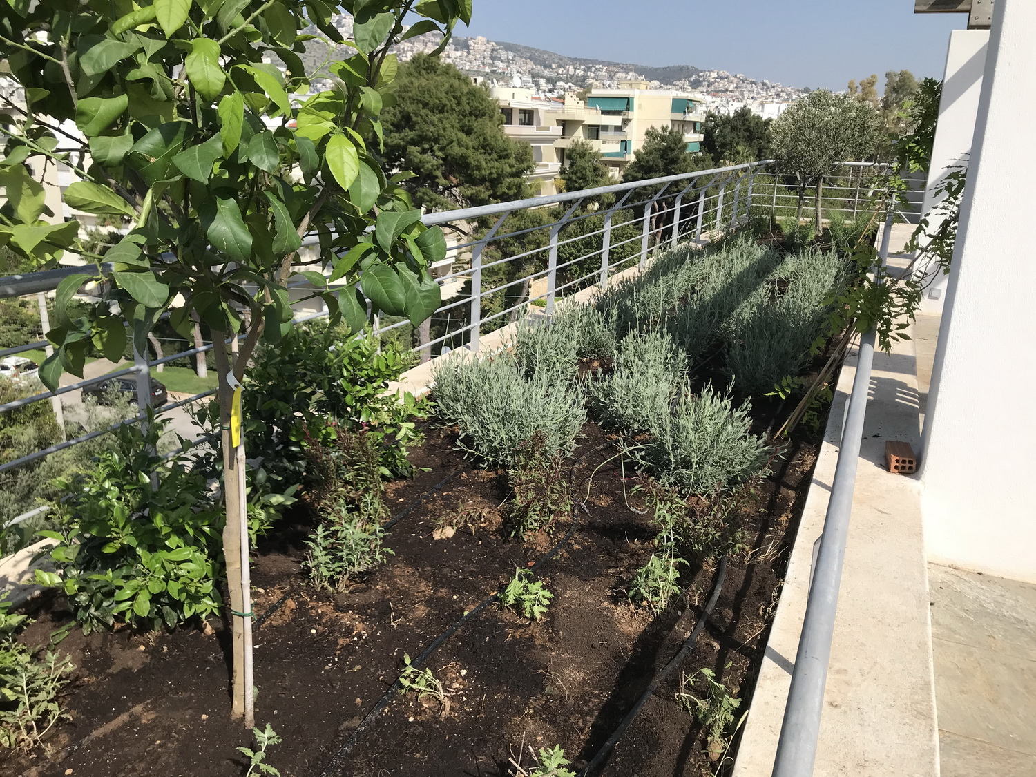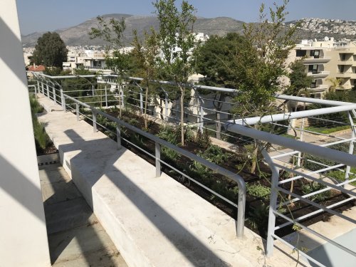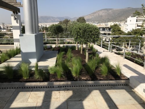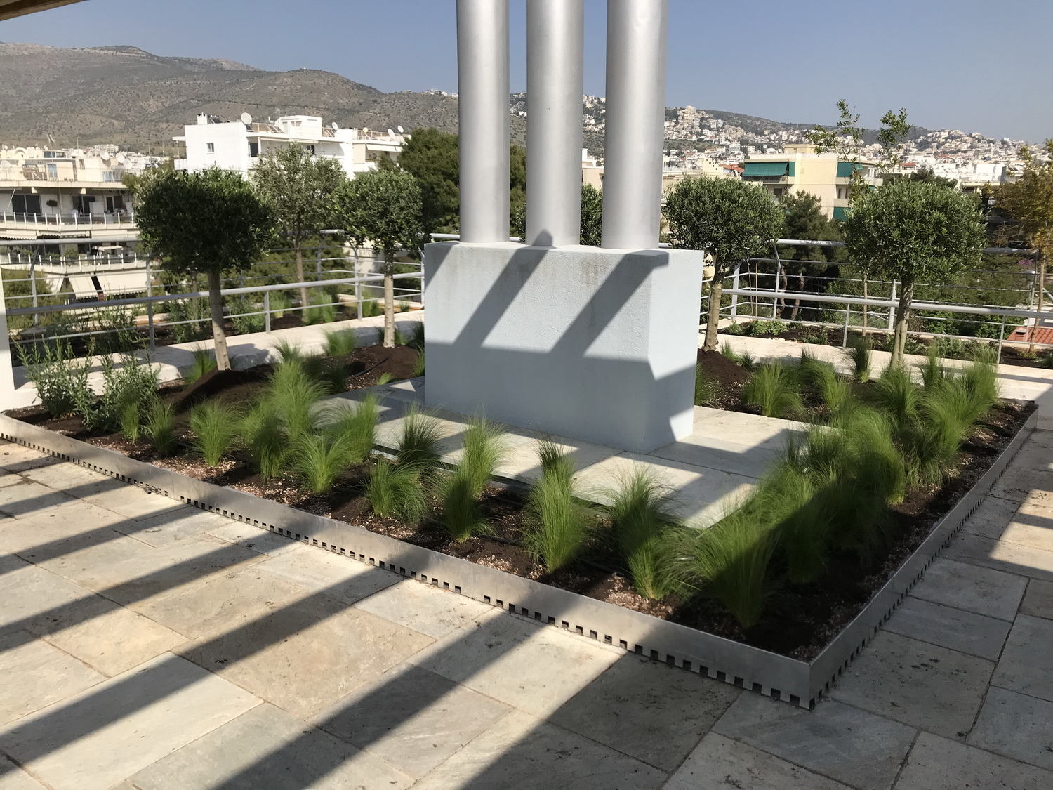 On the terrace of a private residence in the area of Glyfada near the sea we created a roof garden of 36 sq. and at the same time we reconstructed the existing jardinières of the house while enriching their vegetation. We decided to plant olive trees, grasses and shrubs that are able to withstand the high temperatures and strong winds of the summer. The area is now well suited for family events.